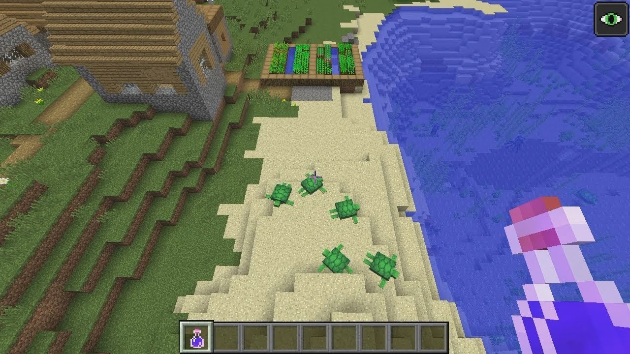 生成在一个有海龟和村庄的温暖海滩上。但背景是什么?那是一座林地豪宅!是的,就在村子附近。