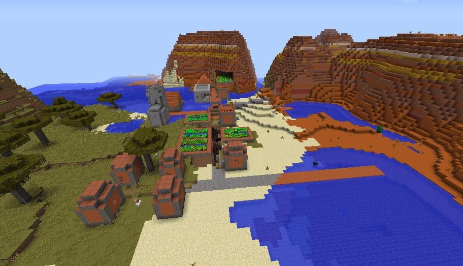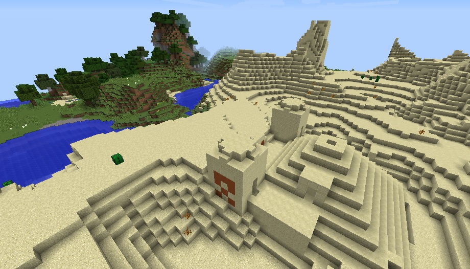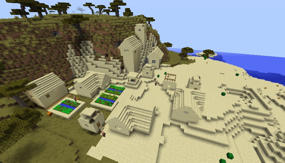 这是一个包含 9 个村庄和 10 个沙漠神庙的 Minecraft 种子!您将在第一个村庄旁边生成。它位于两个生物群落(台地和沙漠)之间的一小片平原生物群落上。