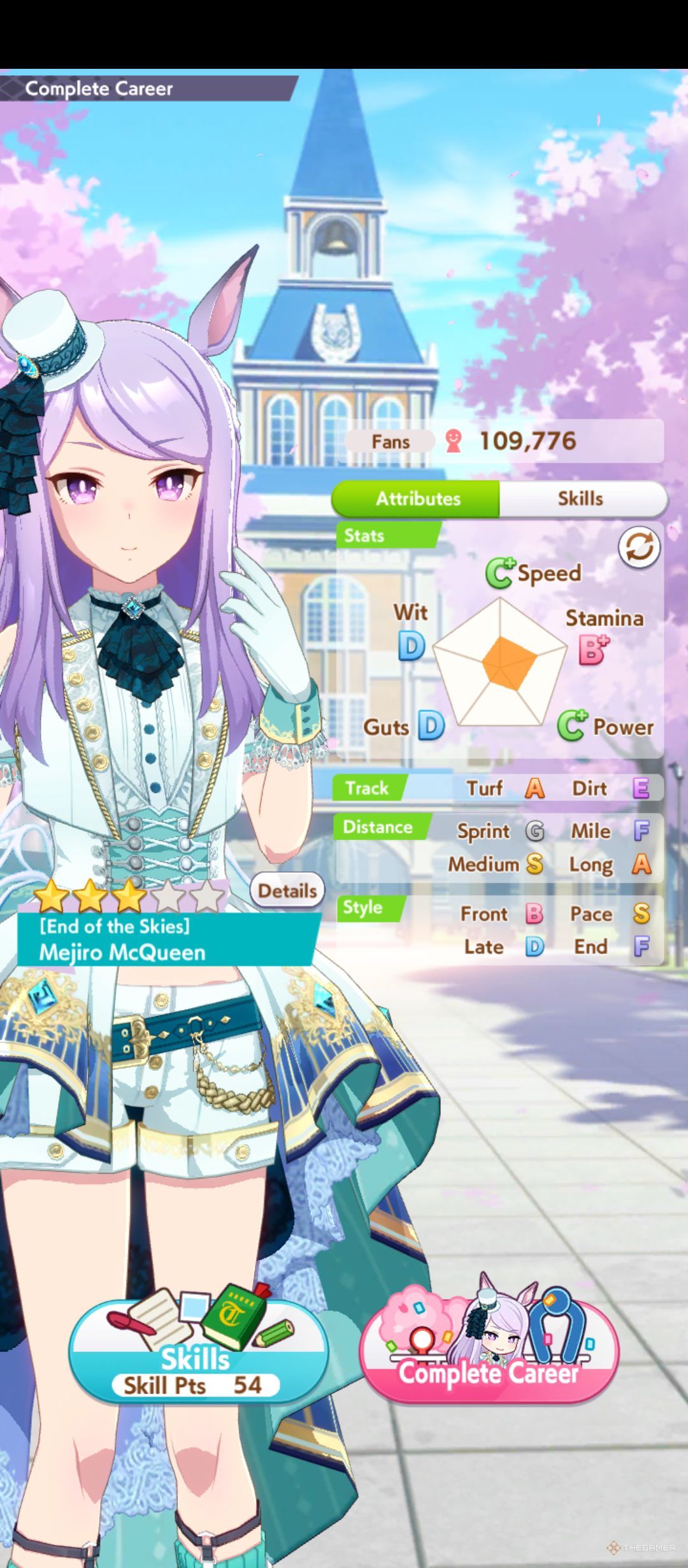 和她的标准不一样构建,你可以充分利用权力在 Mejiro McQueen 天空尽头的构建中。不会让她陷入困境在赛车手的人群中。所以你可以稍微减少对速度的关注,用于与其他跑步者保持距离。