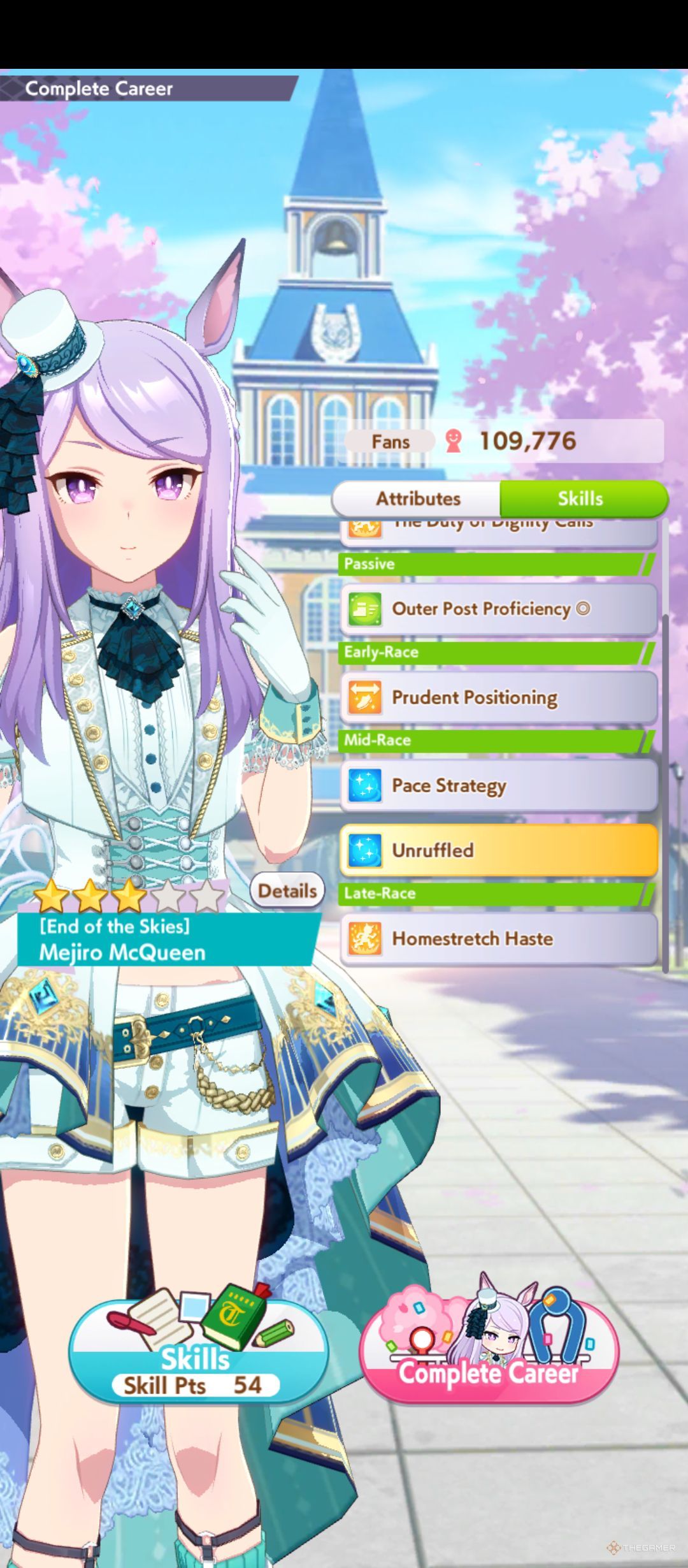 Mejiro McQueen End of the Skies 专长于更长的赛道,所以获得更多耐力保存技能建议这样做,特别是当您无法获取所需的统计数据时。如果你有足够的体力,你应该更多地关注速度和定位技巧。