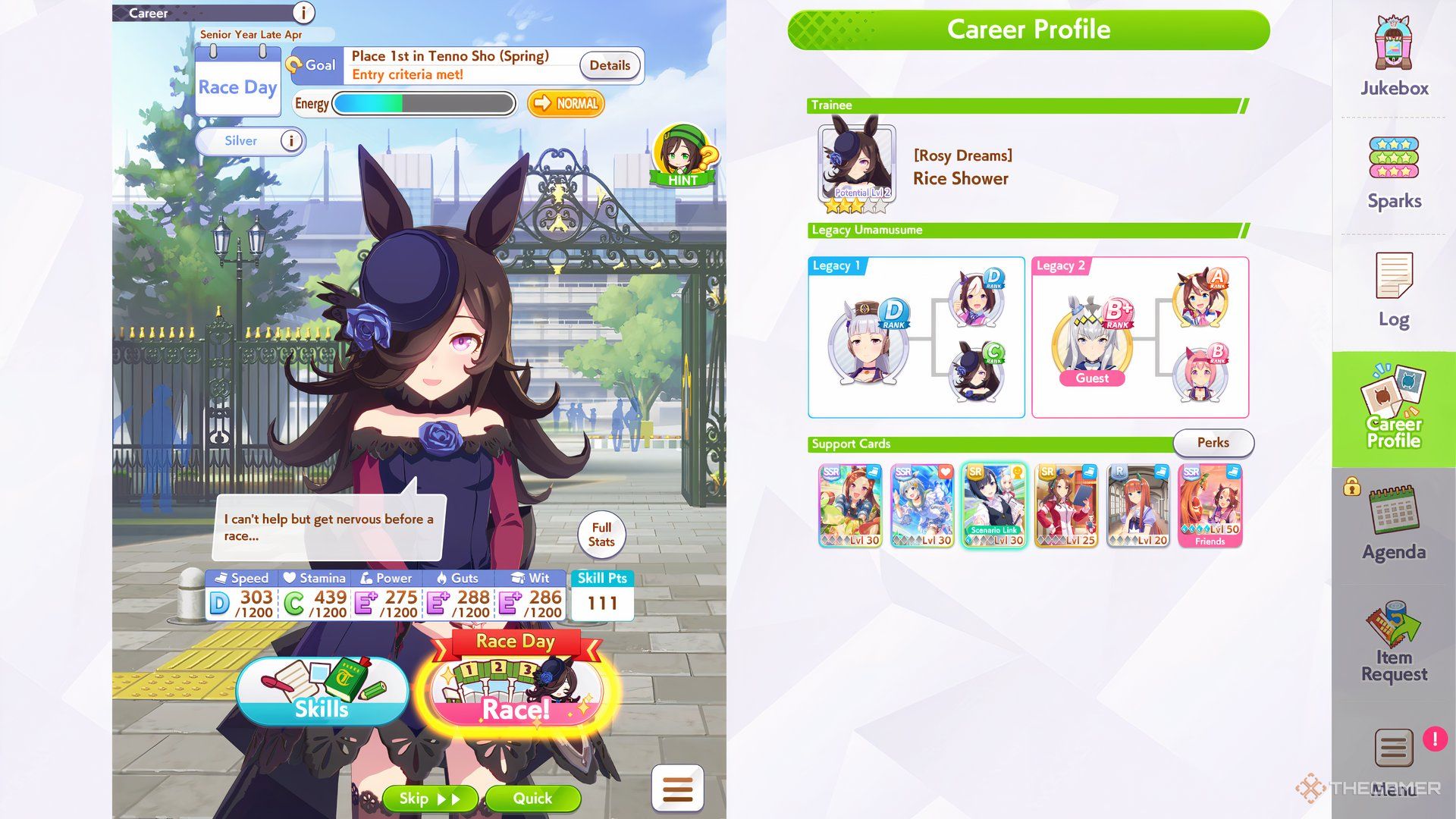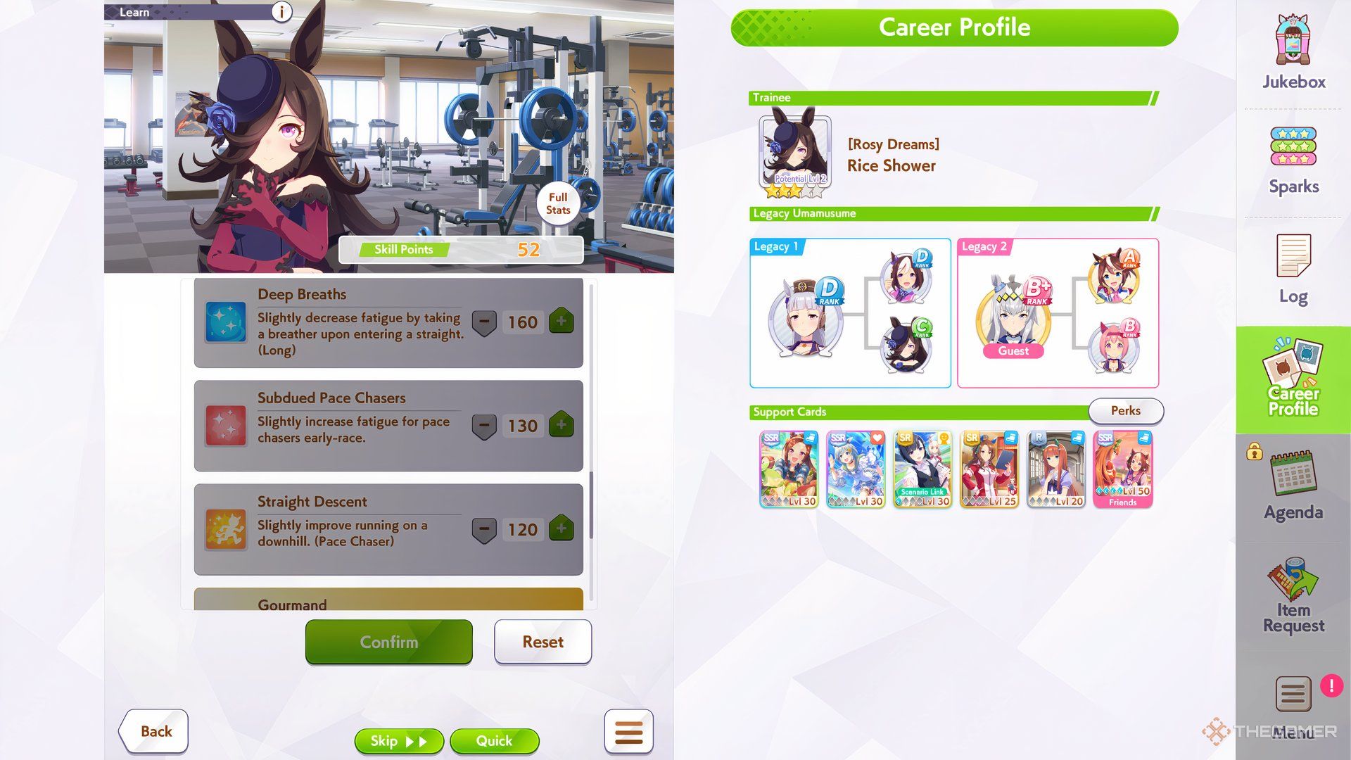 Rice Shower 的最佳构建是她的步伐追逐者身材,所以你需要大量的耐力才能跟上领先者。如果你不落后,你最终会超越它们。这就是为什么重要的是也要关注胆量,这将有助于接近尾声当你的体力达到极限时。