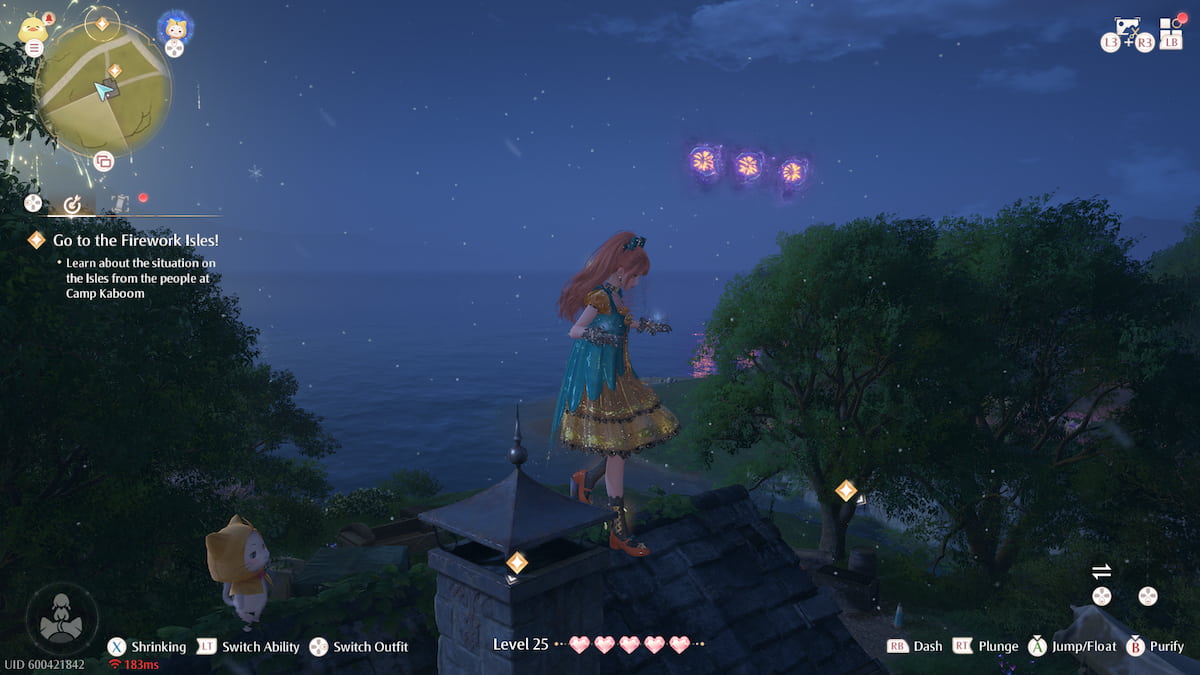 烟花之露以两到四只为一组,分布在从松风高地到清心湖的整个烟花岛。它们通常出现在屋顶和山上,但也可以在洞穴内找到。当你遇到他们时,在附近跳跃或漂浮并向他们的方向发射净化球。当它们以白色突出显示时,您就会知道您已正确瞄准并且距离足够近。烟花露水会飘向你,妮基会自动收集它们。在以下位置找到烟花露珠簇。当您探索该岛时,洞穴中还有更多。