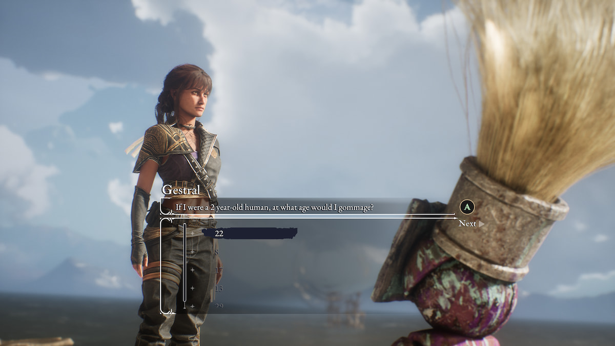完成课程后,前往前方的 Gestral,为您提供古斯塔夫的泳衣。然而,根据您在故事中的位置,奖励可能会有所不同。然后他们会问你,“如果我是一个两岁的人,我会在什么年龄打交道?”当你可以自由地解方程时,任何答案都足够因为 Gestral 不知道如何实际进行数学计算。但如果你真的想知道正确答案,那就是 17,与女画家柱上的倒计时序列相关。