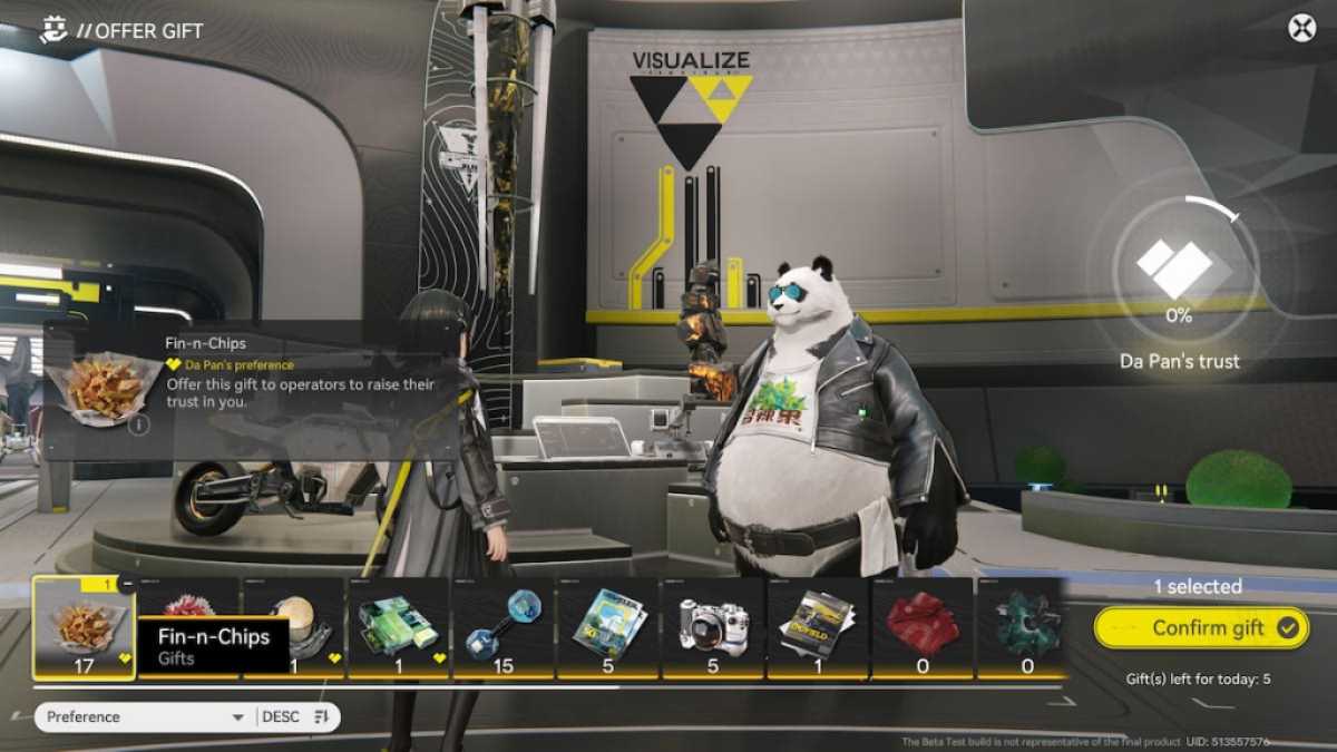 当您这样做时,您将看到一个滚动条,其中包含您可以给予该角色的潜在礼物。选择您之前购买的礼物,然后单击确认礼物。您会注意到此行为会增加角色的信任级别。请注意,角色最多只能接收每天五份礼物,因此如果您的目标是达到特定的信任级别,则该过程可能需要一些时间。