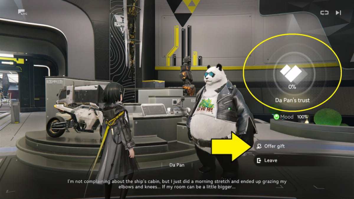 当您获得一些礼物并准备好增加角色的信任度时,您需要首先直接向他们赠送礼物。您只能在 OMV 底江号上向您的角色赠送礼物,所以请确保您处于正确的位置。您拥有的任何可玩角色都会在船上积极走动,因此首先要找到他们。找到他们后,与他们交谈并选择提供礼物选项。