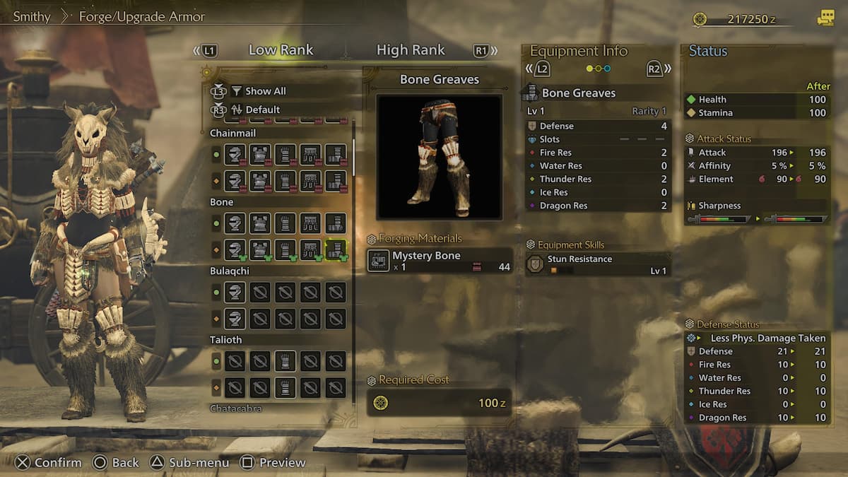 骨甲需要五块神秘骨头来制作整套,包括护胫、线圈、臂甲、锁甲和头盔。它的防御能力比希望、皮革和链甲更强一些。然而,我建议瞄准怪物的其他入门套装,因为它们有更多的保护。