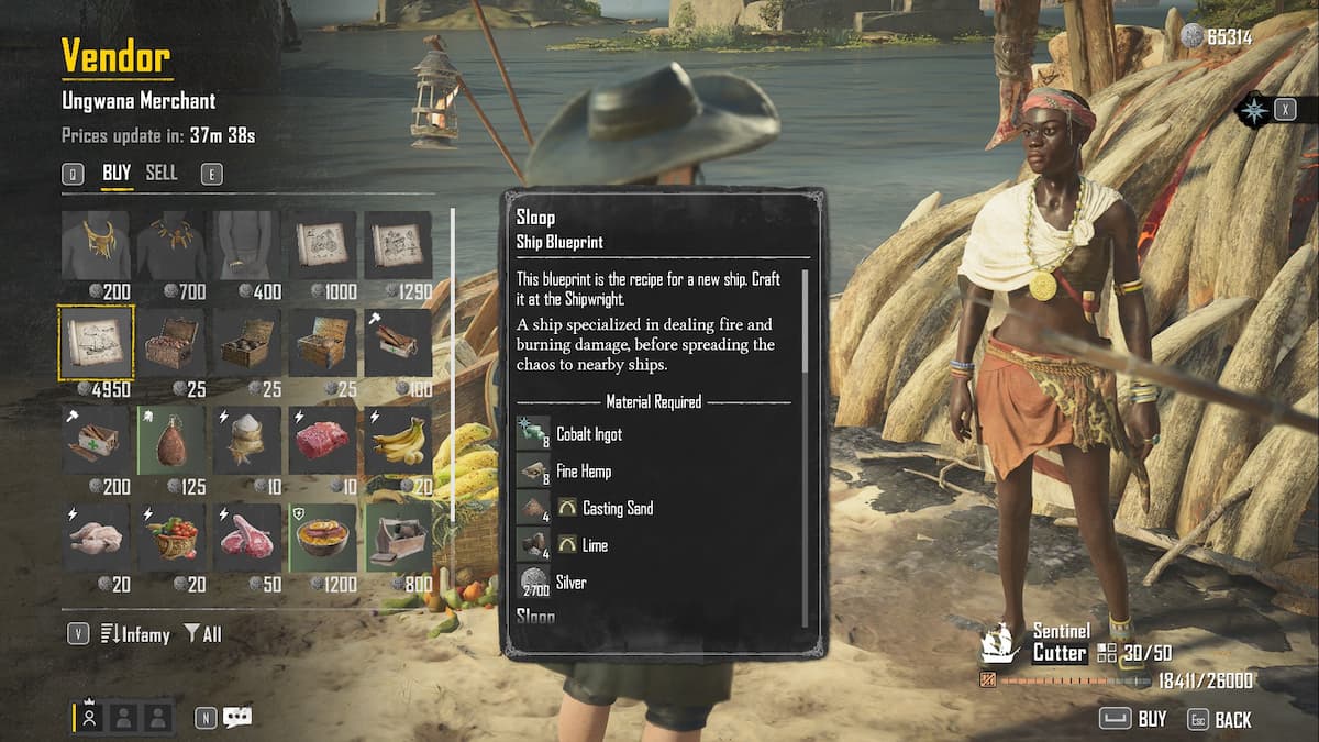 与接骨木蓝图,您无需达到一定的臭名昭著级别即可购买 Sloop 计划。只需与着陆区的 Ungwana 商人交谈并交出 4,950 银币即可。如果你不想为此投入硬币,请等到你得到魔鬼的策略寻求。完成后,您将获得冲击波单桅帆船蓝图作为奖励。