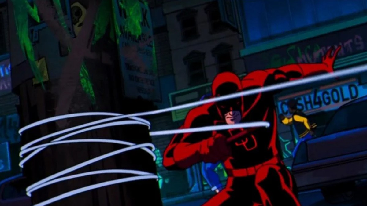 《夜魔侠》还在《宽容就是灭绝——第三部分》中客串。与钢铁侠和奇异博士不同的是,无畏者在有限的放映时间里摆脱了束缚。在《X 战警 97》第一季大结局中,夜魔侠标志性的比利棍棒得到了充分的锻炼,这位盲人治安维持者竭尽全力遏制了纽约市的骚乱。根据他的设计,这似乎与《蜘蛛侠》和《神奇四侠》中出现的霍恩黑德是同一个人。