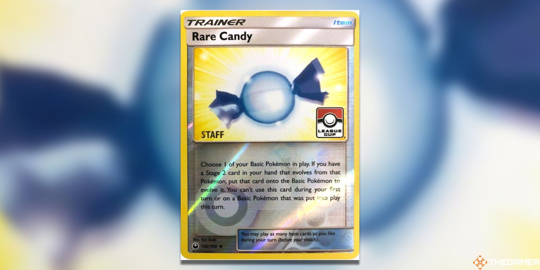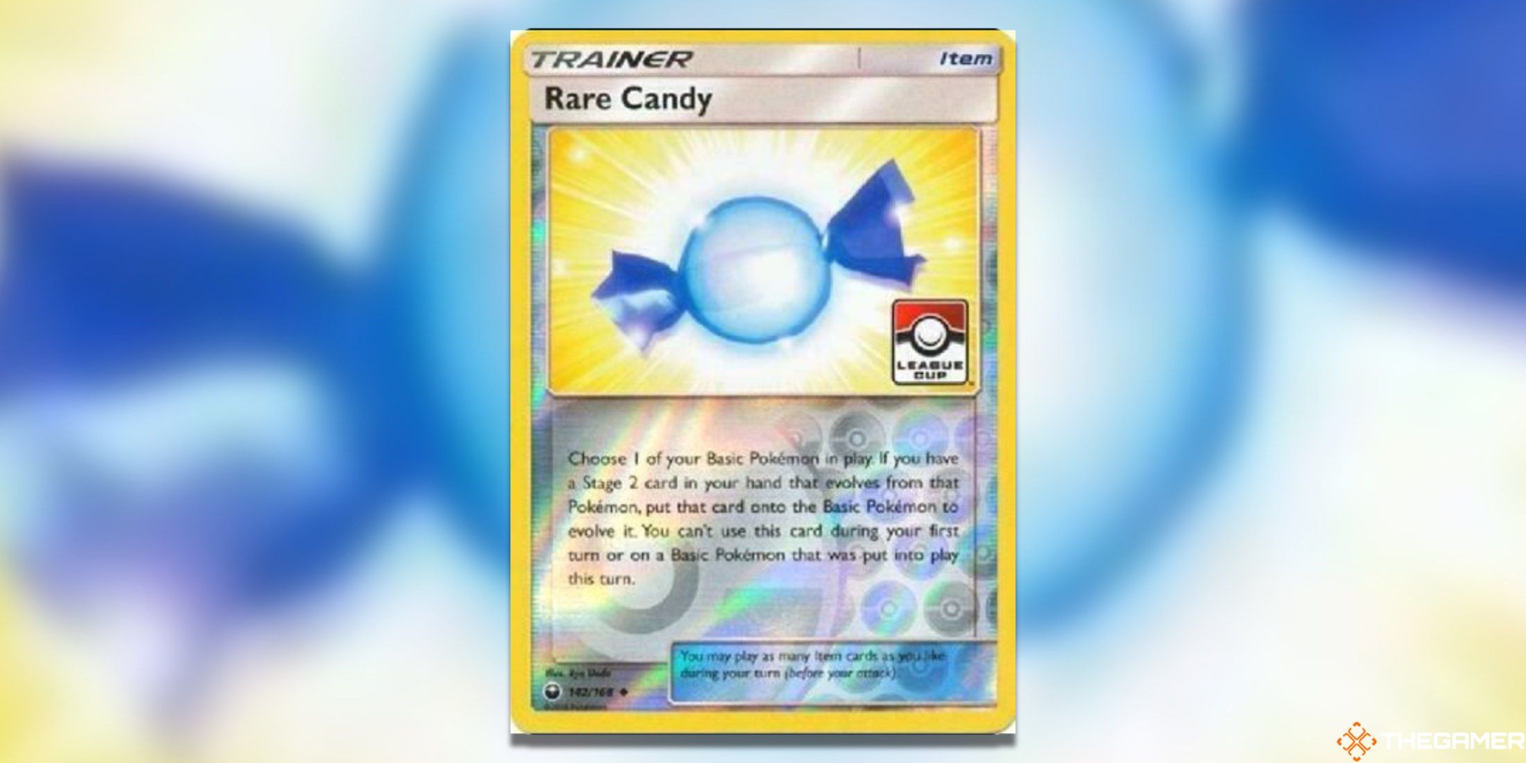 除了拥有稀有糖果卡的常规套装外,您还会发现一系列特别昂贵的版本,这些版本被用作各种活动的促销卡,例如这个联赛杯促销卡。该宣传片从 2018 年开始作为奖励分发,因为其艺术作品来自天体风暴系列。