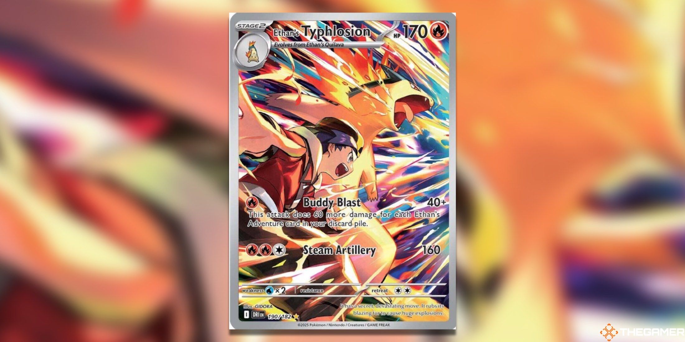伊森的 Typhlosion 可以说是《命中注定的对手》中最令人惊讶的卡牌之一,因为它错过了该系列的特殊插图稀有 (SIR) 阵容,而选择了插图稀有 (IR)。然而,尽管有这种轻微的冷落,艺术作品还是很激烈的,因为伊森和泰夫洛西翁都在准备攻击。