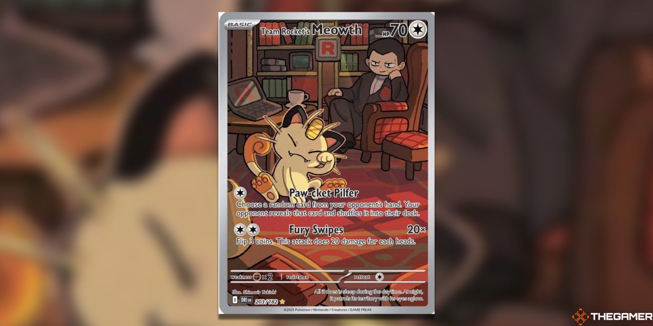 说到视觉上吸引人的卡片,爱猫人士和乔凡尼粉丝一定会喜欢火箭队的 Meowth 插图稀有。乍一看,这件艺术品有点单调和黑暗,但红色地毯和五彩缤纷的书籍提供了微妙而刺激的色彩,让一切变得有趣。
