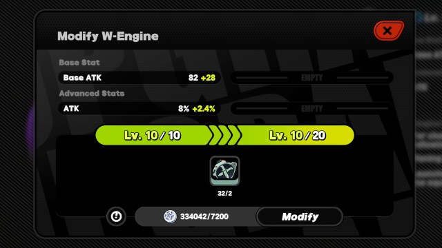修改 W 引擎会将其等级上限提高 10 级。要修改 W 引擎,请从角色的设备选项卡或贮存, 选择提高,单击箭头旁边的水平,然后调整。
