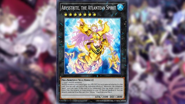 | 影響 | 7級以上水屬性怪獸2只以上 自己場上的水屬性怪獸的攻擊力/守備力每有這張卡附加的素材個數×300。 「Abysstrite, the Atlantean Spirit」的以下效果1回合只能使用1次。這張卡多維召喚成功的場合:以自己墓地的1只等級7以下的魚族、海蛇族、水族怪獸為對象發動。將其特殊召喚。可以將這張卡的1個素材取除;從你的卡組設置 1 個“深淵-”陷阱。 |