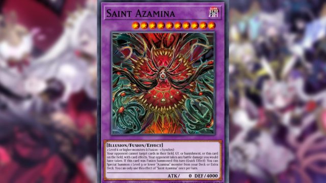 | 影響 | 6星以上怪獸2只(融合1+同調1) 對手不能以自己場上、墓地、除外的卡以及場上的這張卡為卡的效果的對象。你的對手會承受你本應承受的任何戰鬥傷害。這個回合這張卡融合召喚成功的場合(快速效果):可以從自己的卡組或者額外卡組特殊召喚1只等級9以下的名字帶有「阿扎米娜」的怪獸。 「聖阿扎米娜」的這個效果1回合只能使用1次。 |