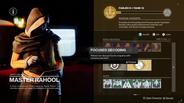 一旦你已經與 Rahoo 大師一起達到 16 級,你可以用他的專註解碼服務選擇您喜歡的任何異域盔甲。每件護甲需要一件異國印記和一件異國密碼。後者可以在 Xur 每周訪問期間從他那裡獲得,也可以從 Rahoo 本人在他的排名獎勵中獲得。