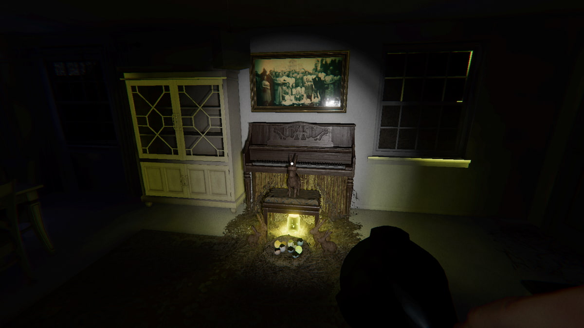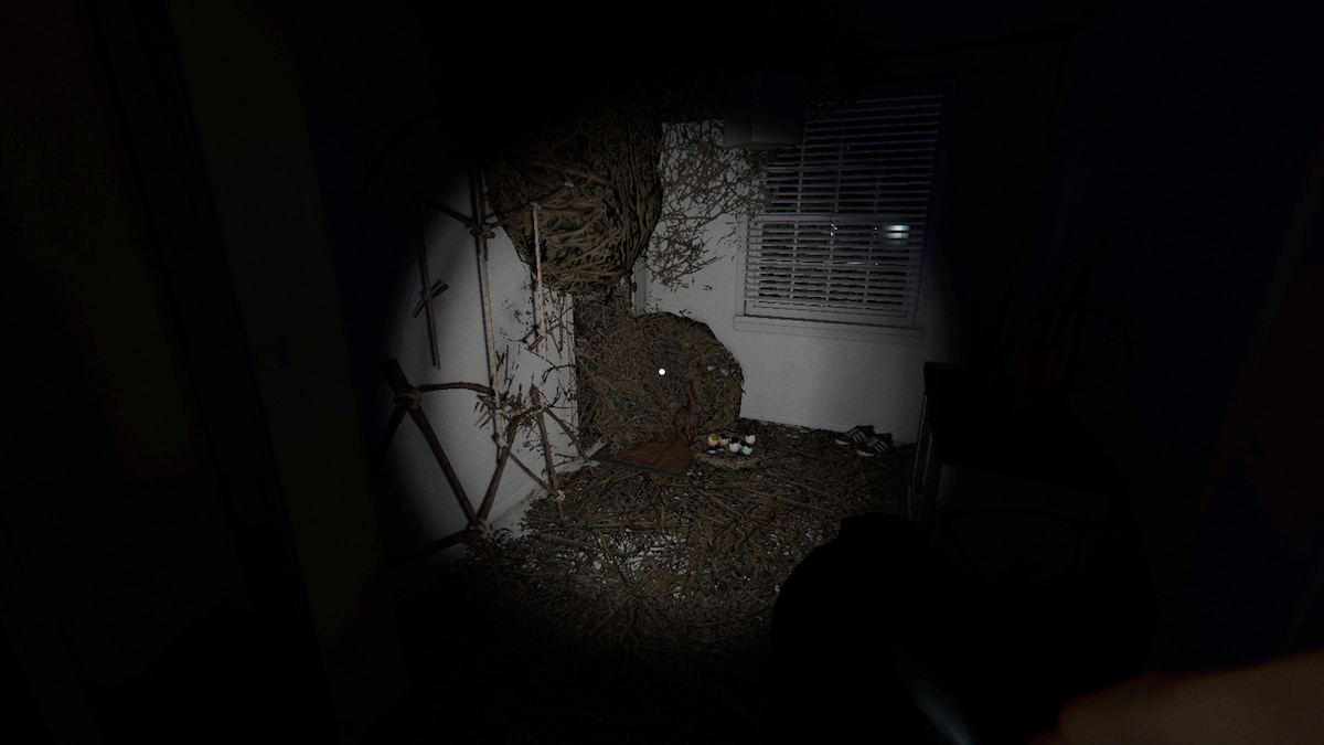 走近鋼琴飯廳下一個。從廚房回到主走廊,然後徑直經過有後門的角落。在餐廳裡,你會在房間中央鋼琴旁邊的地面上找到鳥巢。