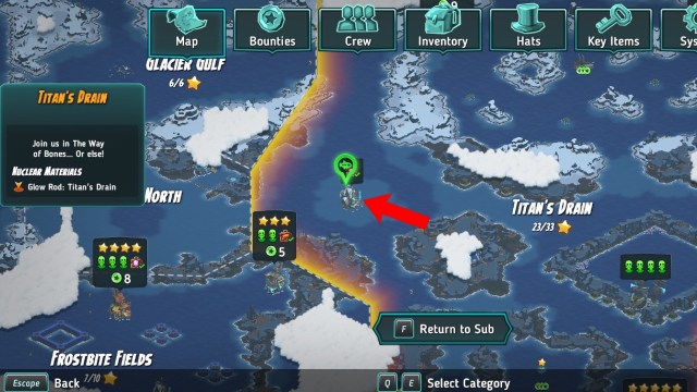 參觀龍頭在泰坦的排水溝並與連帽人物在左下角。他們會跳上你的潛艇,給你一根發光棒,並透露他們的秘密身份。最後!