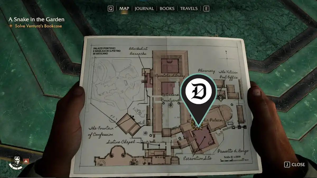 在探索天主教宮殿時,您會發現花園裡的蛇之謎。這是一個禁區,探索起來很危險,但如果你準備好在短時間內乾掉幾個守衛,那麼它不會被限制太久。處理完他們後,前往文圖拉帶著龍雕像的辦公室,你可以在他的桌子上找到一張紙條,描述了放在書架裡的四本書。這些書被放置在特定位置,必須按字母順序移除。
