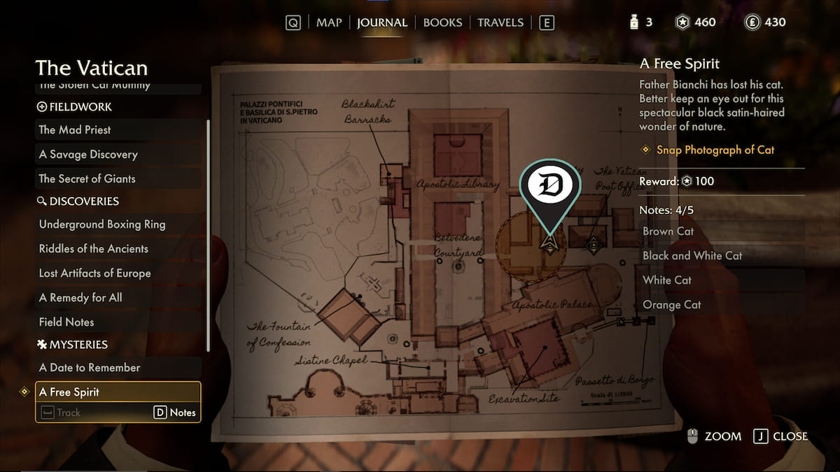 在梵蒂岡東側,尼古拉五世塔對面,有一個海報牌,上面貼著一隻失踪的貓。比安奇神父失踪了他心愛的貓,但尚未找到它。使用相機時,您必須拍攝五隻不同的貓整個區域,以縮小這只失踪貓科動物的位置。
