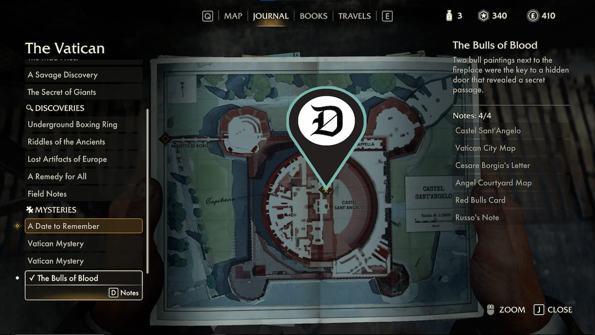 血之公牛之謎出現在您前往梵蒂岡旅行的第一部分,同時參觀聖天使城堡。如果您錯過了血之公牛之謎,您可以在探索梵蒂岡時回到這個地點。你可以原路返回,但可能需要一些時間才能再次到達中心區域,而且還有更多的守衛。