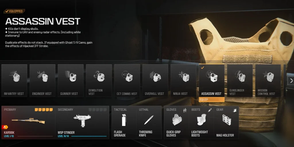 為了補充您的 Kar98k,請考慮裝備刺客背心,它可以隱藏敵人的殺戮頭骨,並保護您免受無人機和雷達的影響。快握手套、輕型靴子和彈匣皮套將分別提高你的武器交換速度、移動速度和裝彈速度。