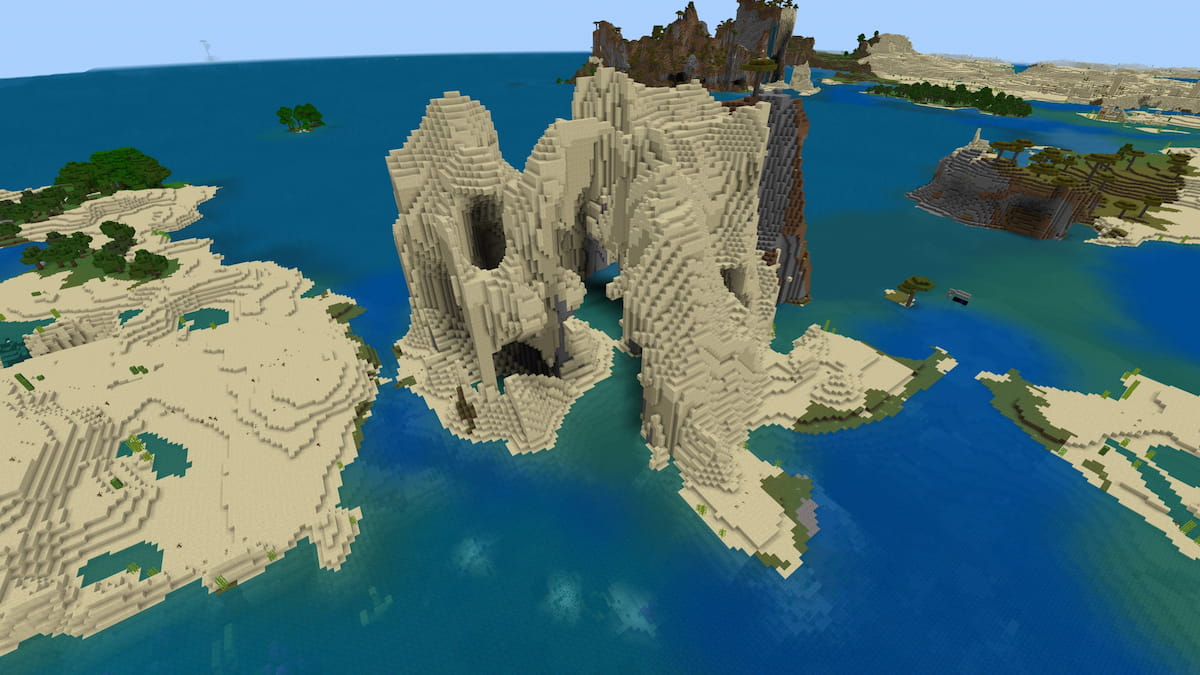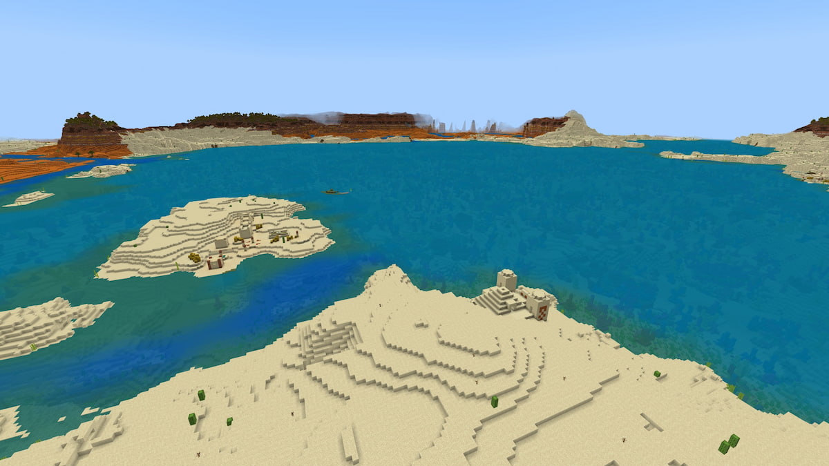 珊瑚礁是Minecraft中最美麗的生物群落之一,因為它們的鮮豔色彩和可愛的熱帶魚。雖然這是珊瑚礁生物群島的典型美學,但它既足夠了,卻很漂亮。湖邊的邊緣周圍有三個沙漠村莊和三個沙漠寺廟。此外,您會發現礁石本身的一些沉船和溫暖的海洋廢墟。