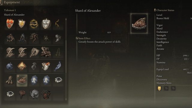 這亞歷山大碎片當使用具有獨特技能的武器時,護身符始終是一個可靠的選擇,因為它可以增加技能的強度和造成的傷害量。這龍冠巨盾護符應該在任何版本上使用,主要是因為它是遊戲中最好的防禦選項。最後,蔚藍種子護身符+1會讓你很少用完 FP 並且總是有足夠的 FP 來使用 Romina 的 Putrification。