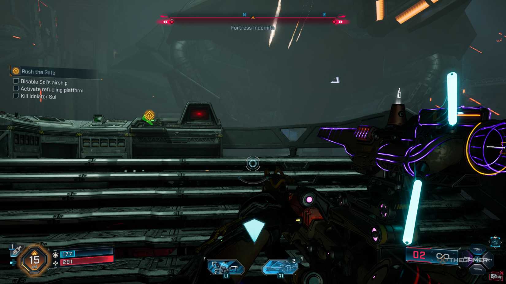 完成後,返回入口並前進到入口正前方的平台上。從那裡,你應該能夠看到一個抓斗點。把自己拉向它,然後向上前進,直到你看到另一個抓斗點。朝它發射,你會發現兩個對接夾。刪除它們,然後右轉滑翔到遠處的平台,在那裡你會遇到一大群敵人。