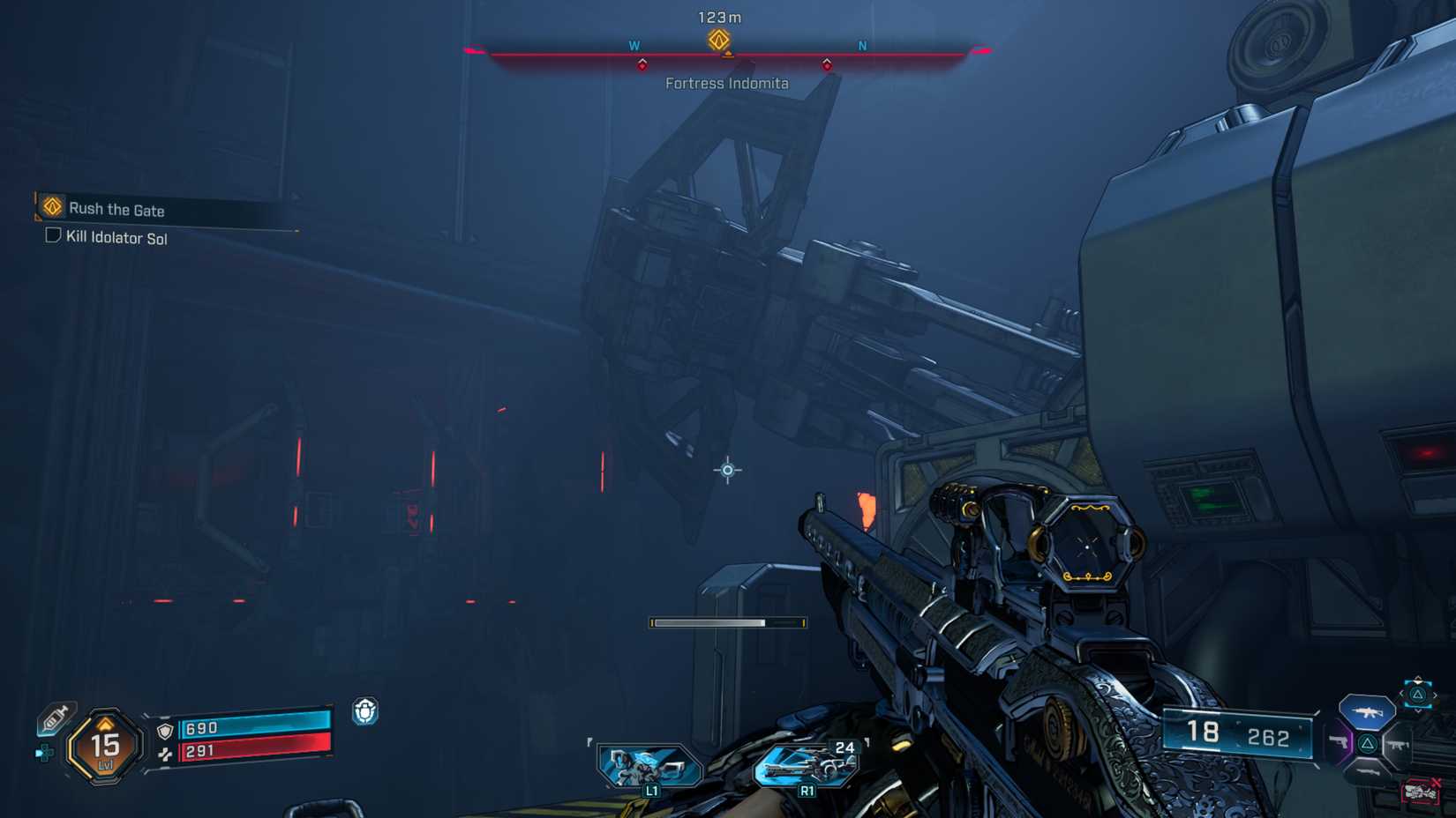 從那裡,穿過大滑動門,按綠色按鈕使平台上升到充滿敵人的競技場。擊敗他們所有人,並穿過另一批敵人,找到一個有自動售貨機和檢查站的房間。下降面對偶像索爾。