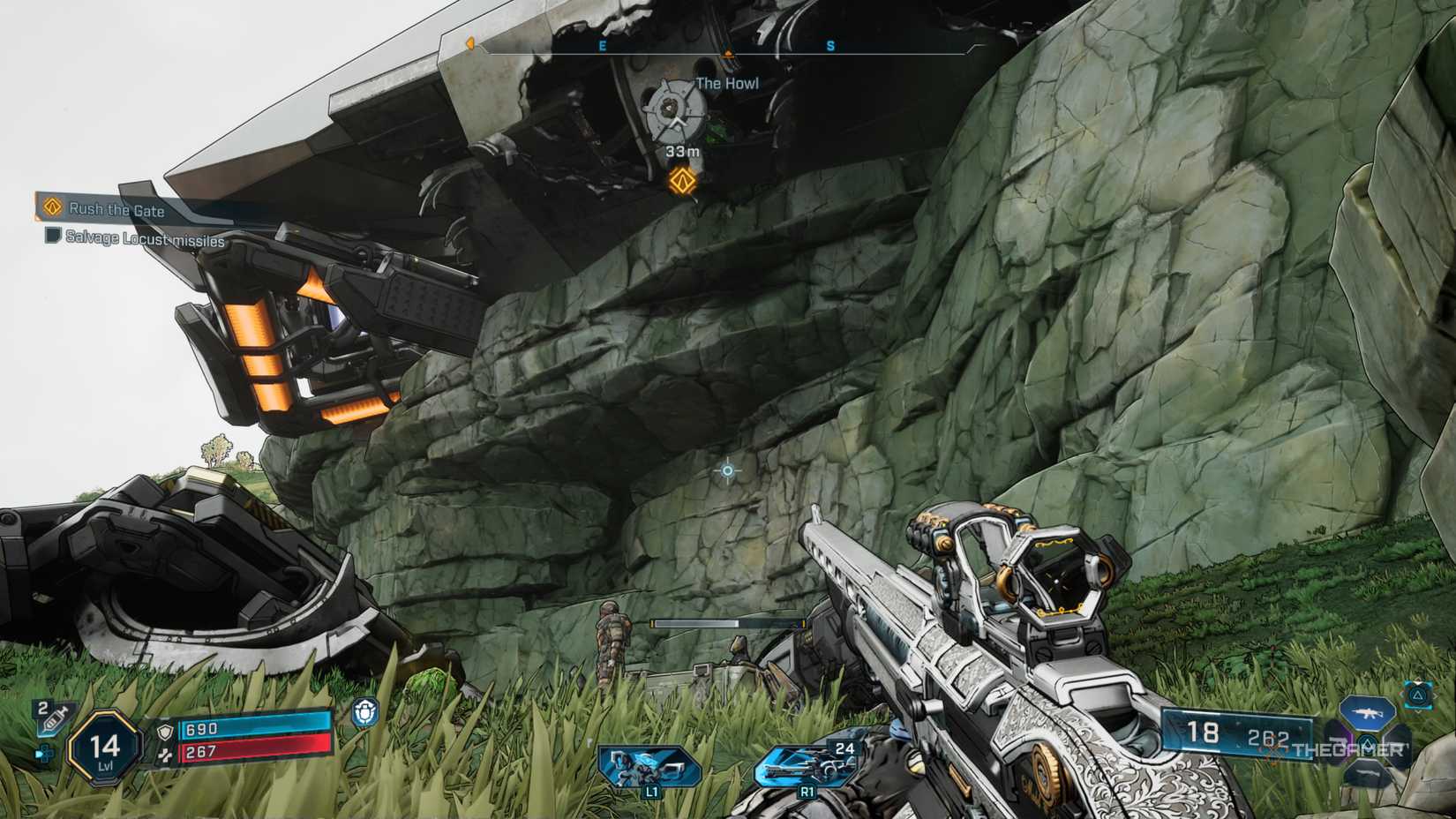 一旦你找到他,護送他的坦克進入掩體。坦克會停在堵住的牆上,拉什會告訴你“拿一些罐子”。他們在坦克的後面。使用抓鉤抓住它們,然後將它們扔到牆上。只需直接點擊一下即可打開它,這樣您就可以繼續。前進並擊敗所有敵人。