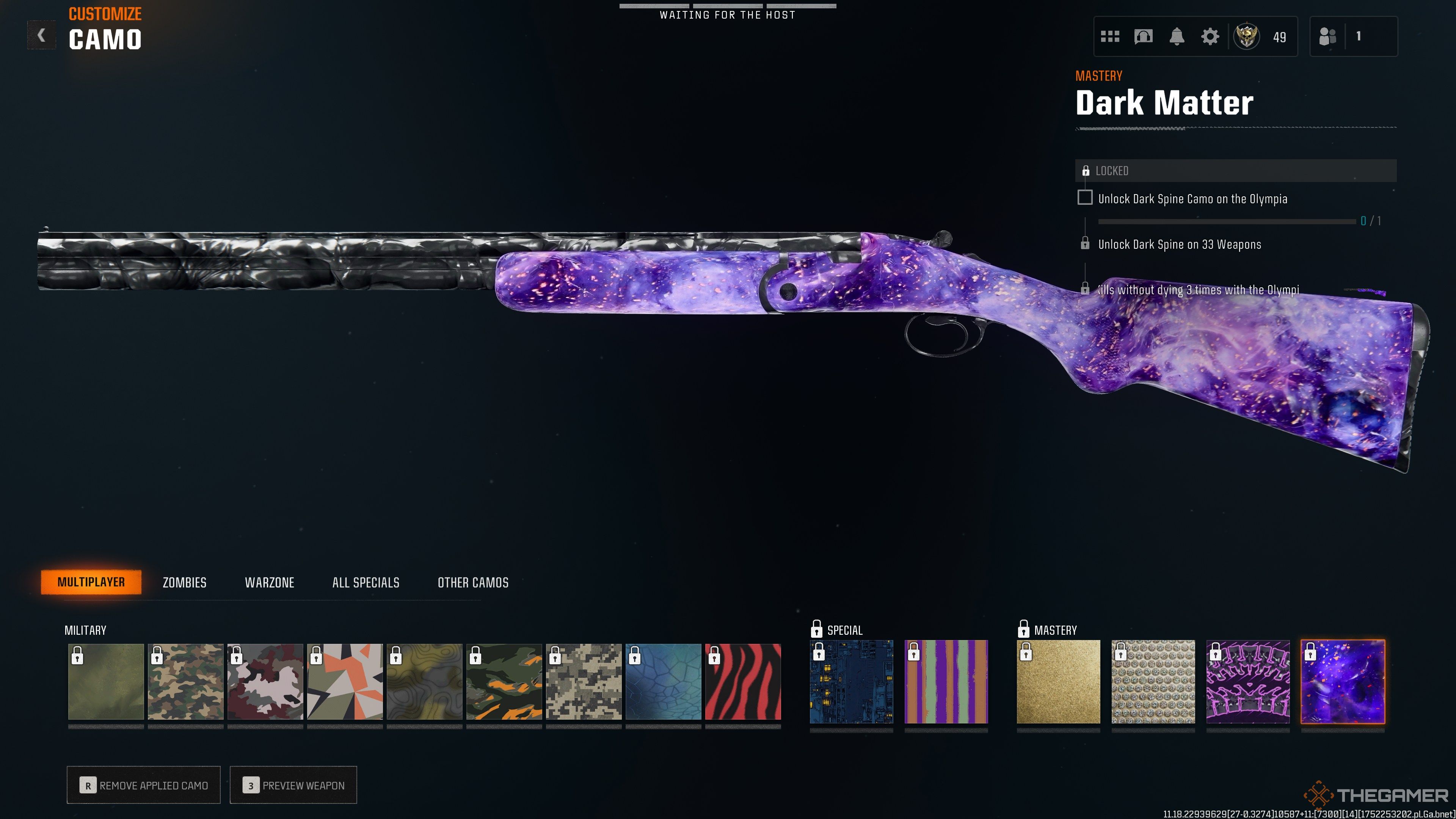 與《黑色行動 6》中的所有武器一樣,有一系列多人遊戲、殭屍和戰區挑戰等待解鎖。迷彩分為三類:軍事迷彩、特殊迷彩和精通迷彩。軍事迷彩要求你爆頭擊殺;特殊迷彩與特定武器相關,而精通迷彩要求您完成與該武器原型相關的挑戰。