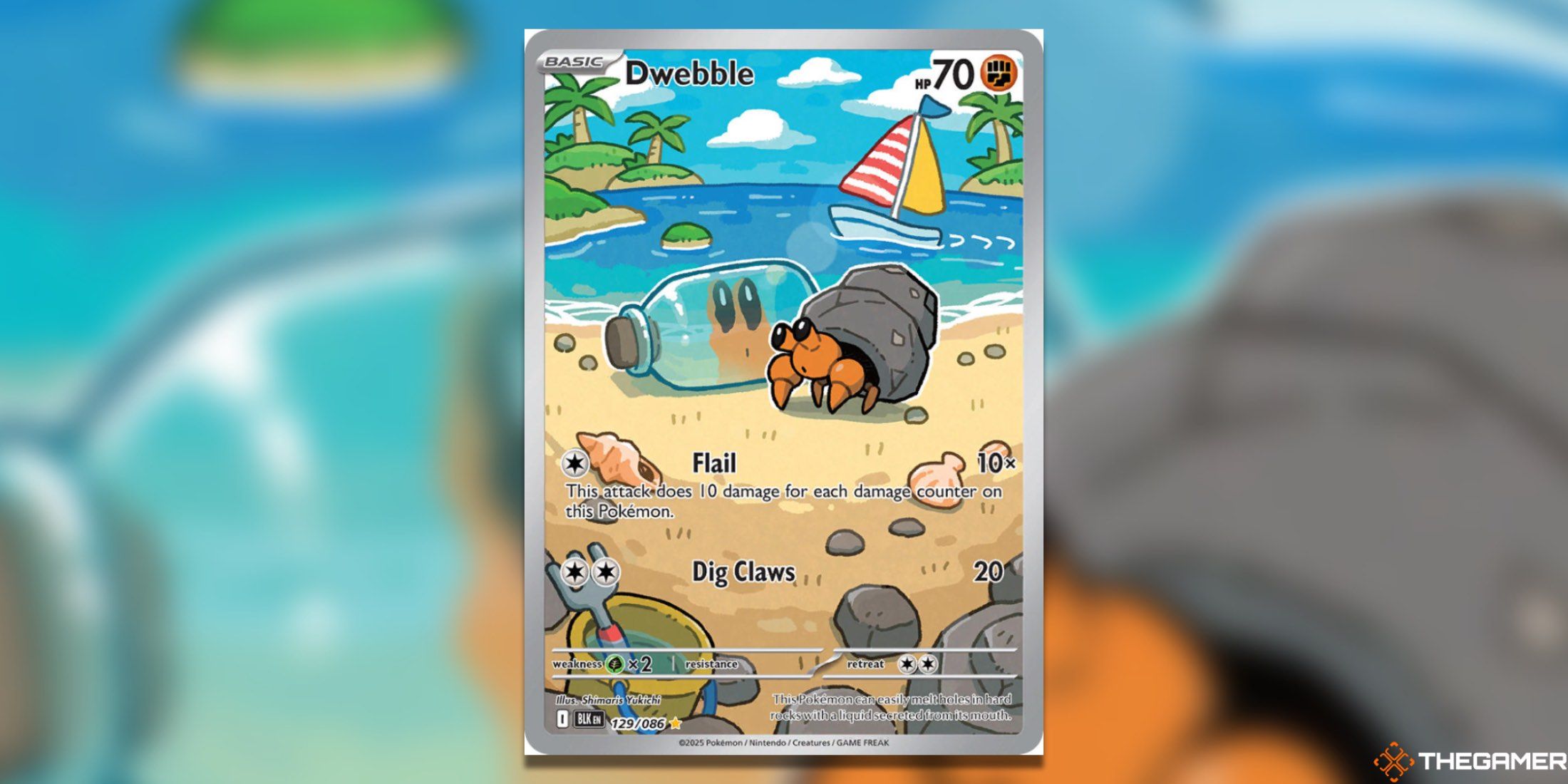Dwebble 可能是您在任何有關黑蝠王或白耀斑的列表中期望找到的最後一個神奇寶貝,但這幅藝術品既可愛又引人注目。明亮的色彩和燈光在這張卡片的視覺吸引力中發揮了作用,但場景的內容更加可愛。