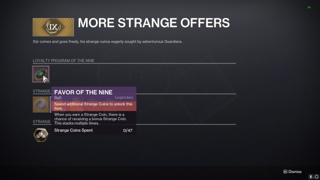 您可以找到九個增益的青睞在 Xur 庫存的“更多奇怪的優惠”部分中,一旦你完成了就可以得到它 達到奇怪硬幣的配額。增益可以讓你賺取額外的金幣,這應該可以消除磨練事件的痛苦。