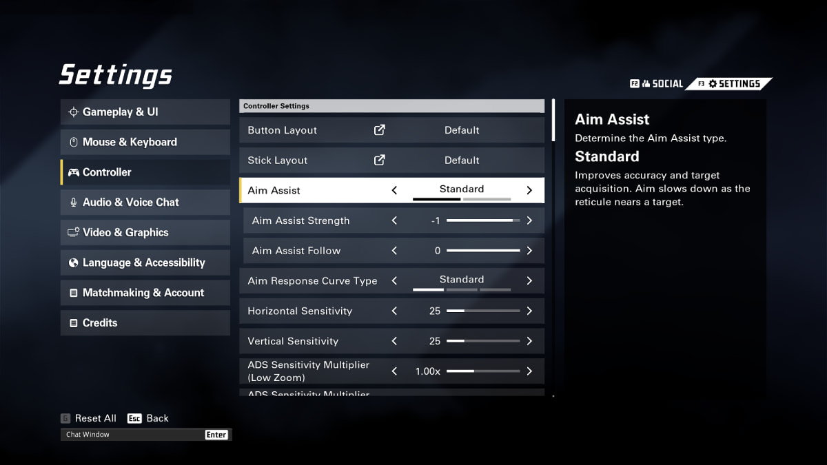 然後,轉到控制器設置鼠標和鍵盤選項下方的部分。在那裡,您將可以訪問瞄準輔助設置。您需要調整的第一個設置是瞄準輔助設置。確保它說標準。如果它顯示“已禁用”,您將在接下來的比賽中無法獲得瞄準輔助。