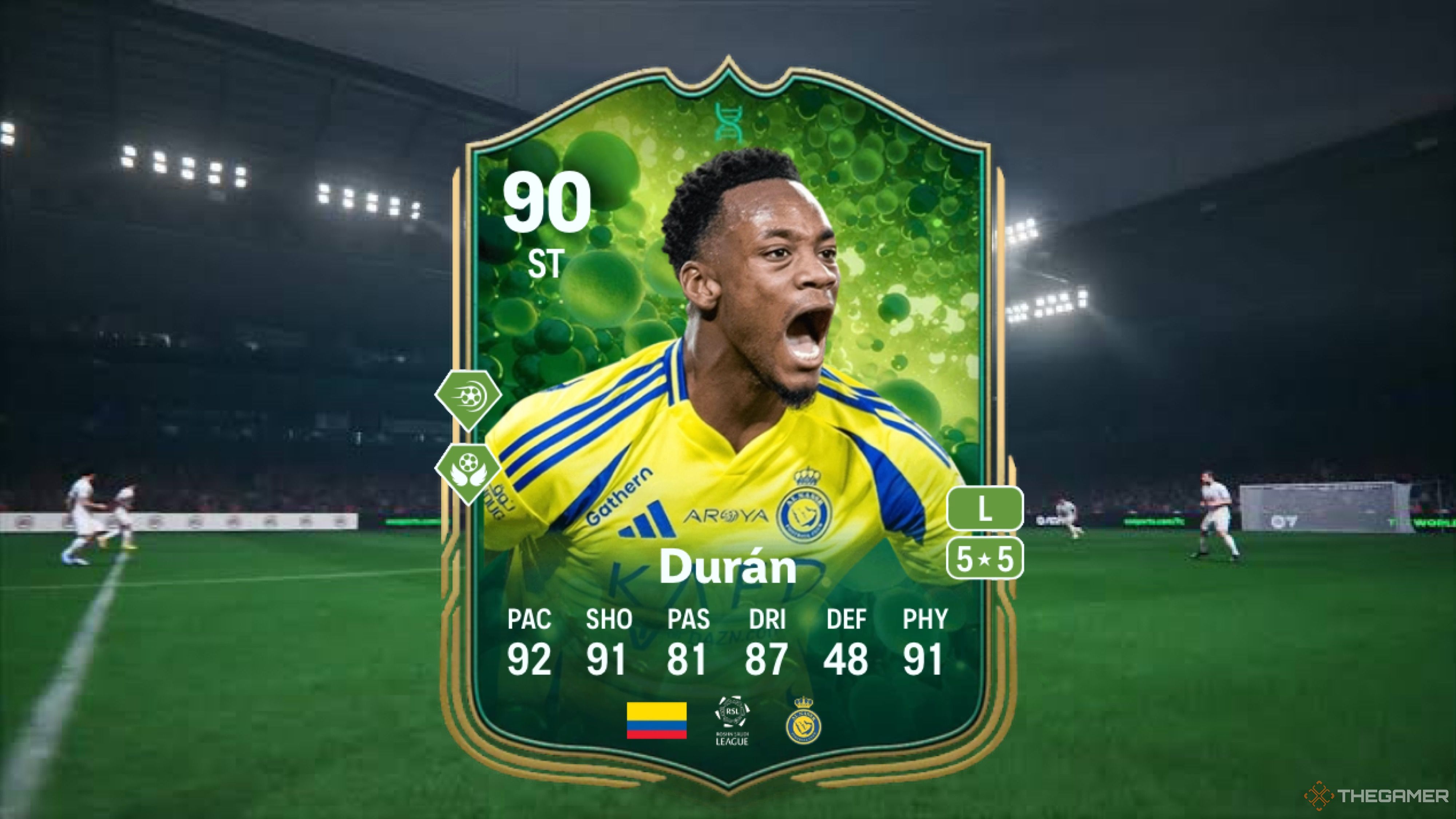 喬恩·賈德·杜蘭·帕拉西奧斯 (Jhon Jader Durán Palacios) 是頂級銀卡玩家之一,擁有出色的終結能力,他的新發光卡擁有登上前線所需的技能。這位哥倫比亞球員離開阿斯頓維拉加盟沙特俱樂部阿爾納斯爾,他將與有史以來最偉大的球員之一克里斯蒂亞諾·羅納爾多並肩作戰。