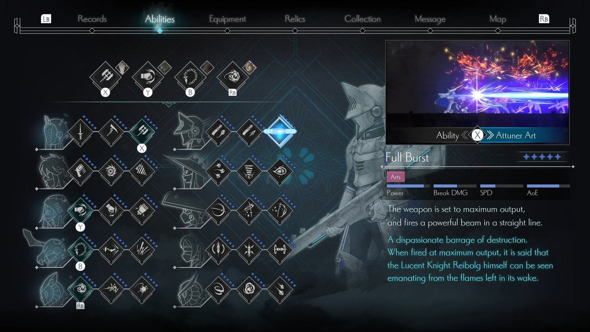 Reibolg的標誌性梁槍具有這種能力發揮了其全部破壞性潛力。 Full Burst提供驚人的力量,巨大的斷裂傷害和廣泛的效果(AOE)覆蓋範圍,是一次射擊敵人的理想選擇。但是,其緩慢的攻擊速度和冗長的動畫(充電幾秒鐘)意味著您需要仔細計時,尤其是在激烈的老闆戰鬥中。