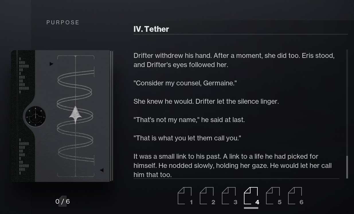 厄里斯稱他為“傑曼”,這可能是我們最喜歡的關於這對二人組的傳說條目:深淵季節的傳說書《目的》。在四.繫繩,厄里斯說服漂流者與斯隆談論她的困境,突然受到奪取力量的困擾。