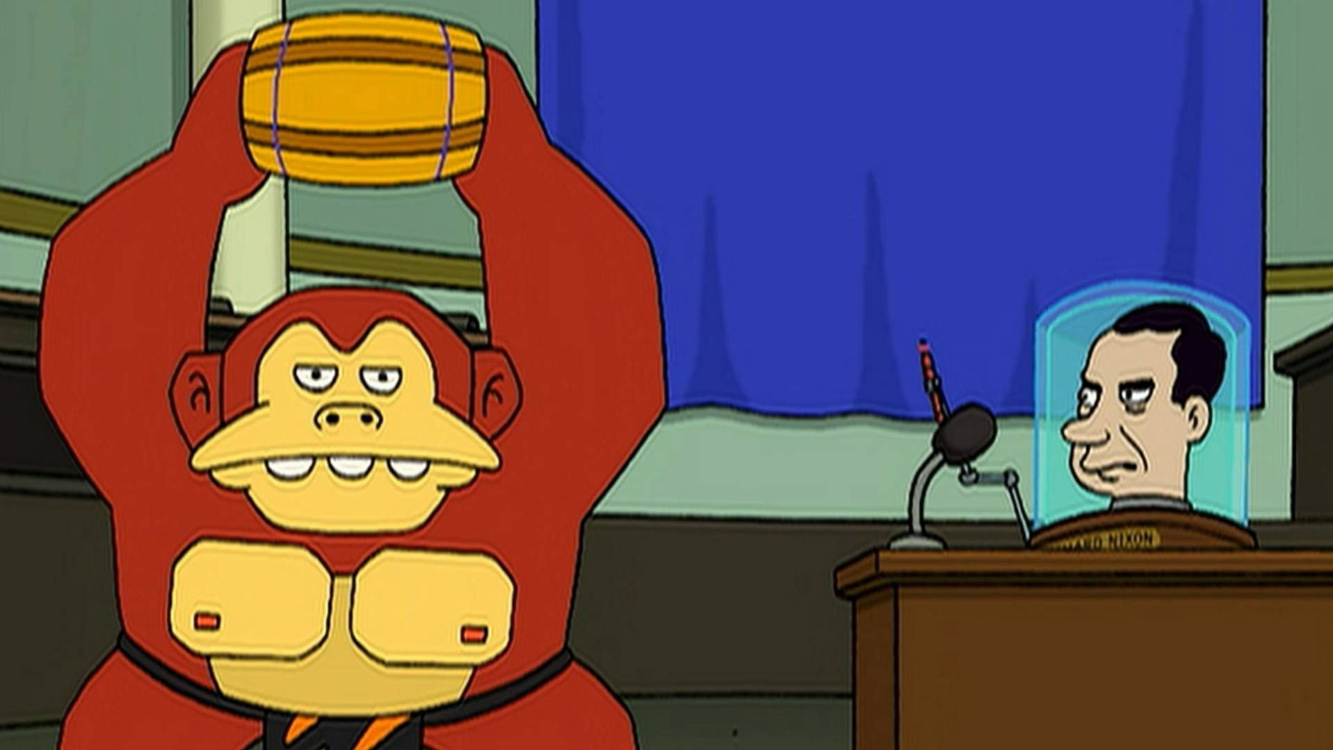 2002 年初,在《飛出個未來》的第 50 集中,有一個場景,一個明顯想成為大金剛的角色向理查德·尼克松總統的無實體頭部扔了一個木桶。