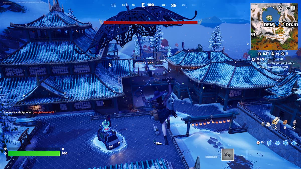 您可以在《堡壘之夜》第六章第一季地圖東北部雪地的惡魔道場找到夜玫瑰惡魔 Boss。道場主建築是夜玫瑰惡魔等待的地方,因此請務必先檢查外部建築是否有武器和盾牌。
