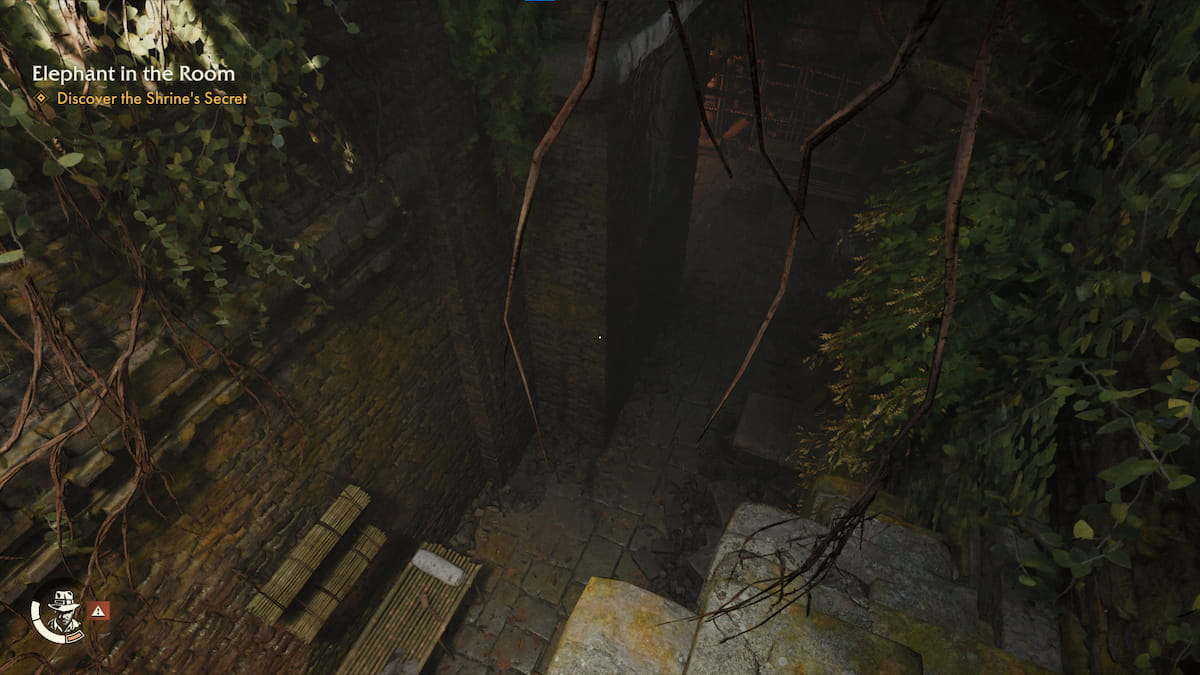 你想要朝這個房間的後面走,直到到達死胡同。從這裡抬頭,爬上竹床。現在你應該能夠跳起來並用你的鞭子爬到山頂,第三隻大象正在那裡等著你。將大象帶到這個秘密房間的入口,您將解鎖佛像下方的最後一個壁龕。