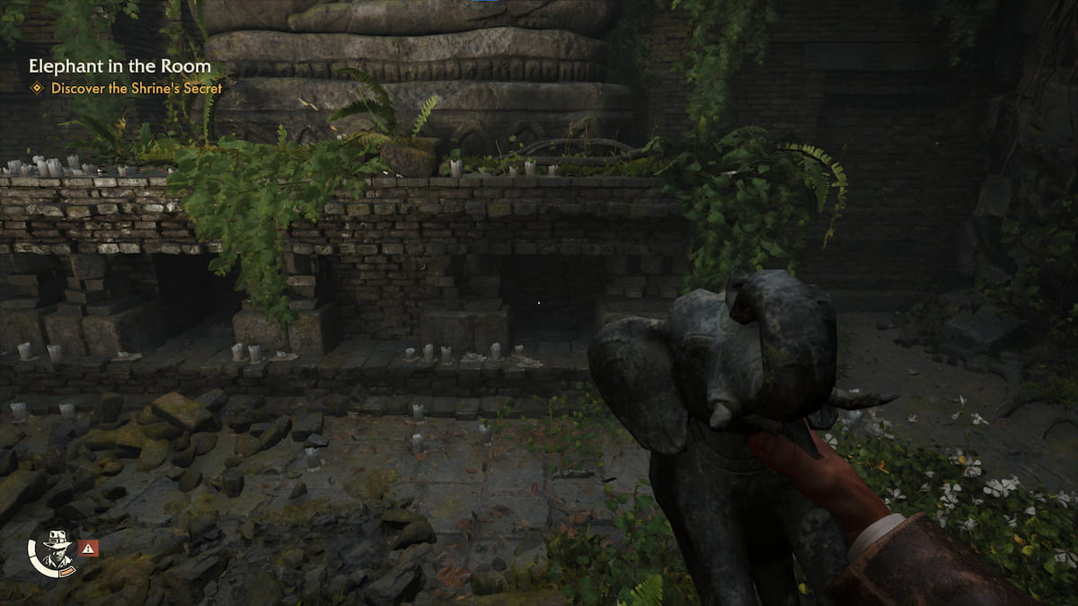 大象雕像是解開這個謎團的核心機制。第一個是打開的,您可以在右側找到。拿起它,放在右邊佛像下方的基座上。這會在最右邊的牆後面打開另一個基座。回到入口處,向左轉,會發現一堵木牆擋住了一段路;你可以用打火機把它燒掉,露出第二個大象雕像。拿起它,並將其放在最右側先前顯示的基座上。
