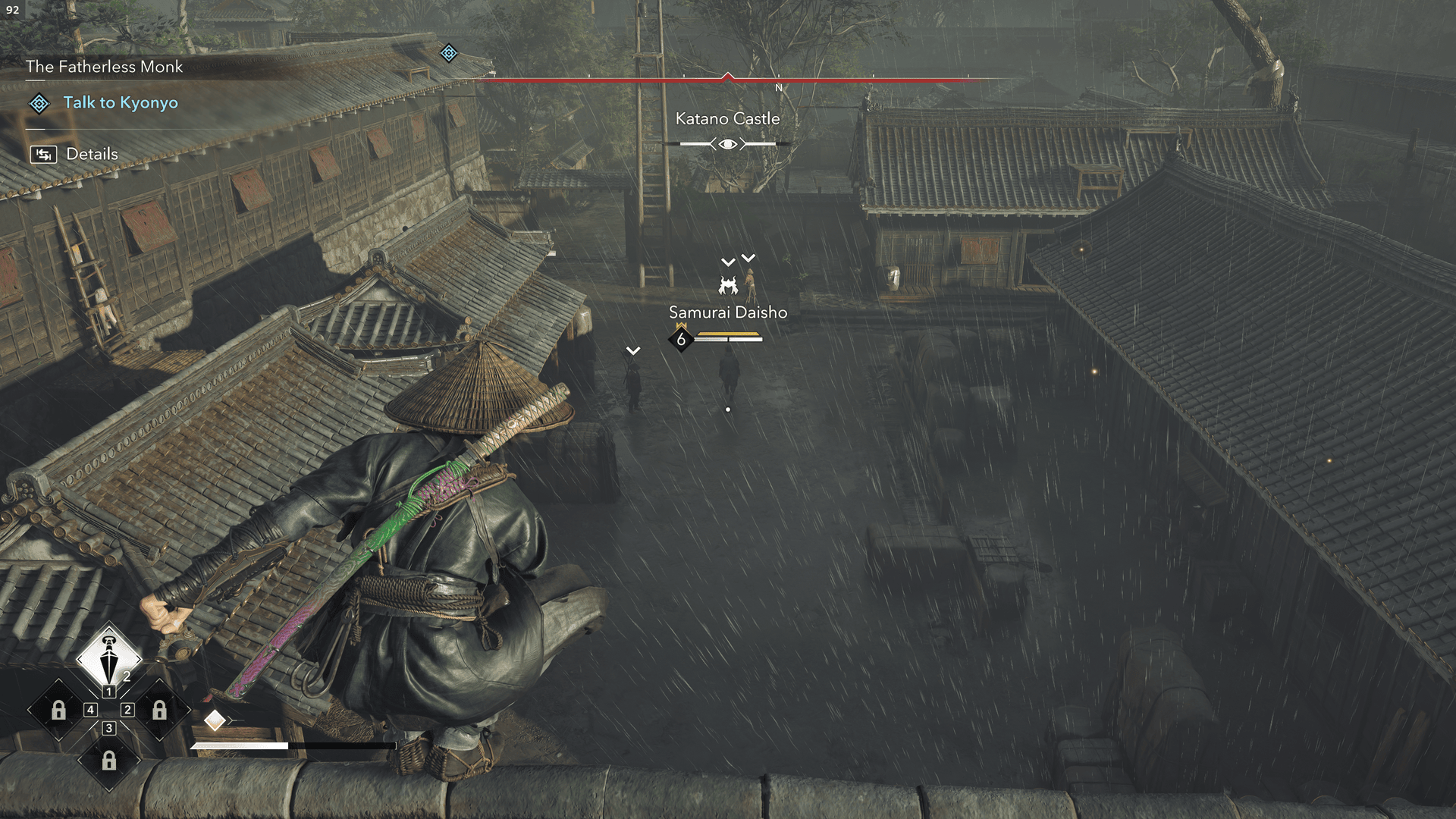 要進入交野城堡,您需要穿過幾座橋樑中的一座並擊敗一些守衛或尋找其他方法進入。進入城堡的最佳方法之一是繞著要塞移動,直到看到一根大樹枝,可以讓您爬上跳下進入該區域,避開高大的堡壘牆和任何守衛。