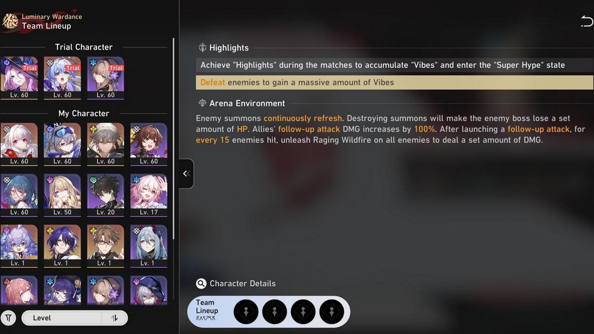 在每場比賽中,您都會獲得三個試用角色,每個挑戰的角色都會有所不同。您還可以為您自己的角色之一獲得第四個空位。在這個位置選擇治療師效果很好,因為試用角色通常足夠強大來應對大多數情況。