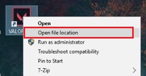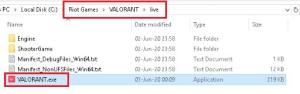 - 右鍵單擊 VALORANT,選擇“打開文件位置”,然後右鍵單擊活動文件夾中的 VALORANT.exe。