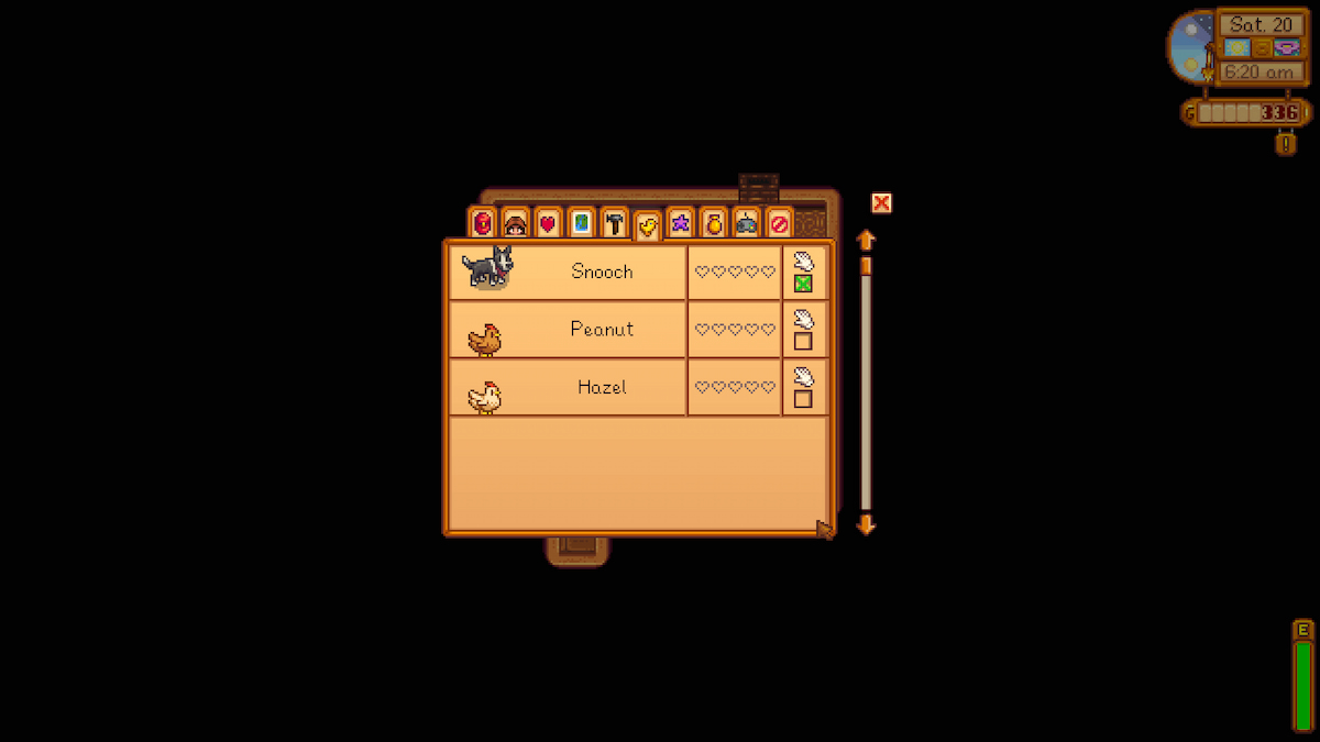 您可以檢查菜單中的“動物”選項卡(以小雞圖標表示),看看您與寵物有多少顆心。一旦這些心被填滿,你就可以選擇收養瑪妮的另一隻寵物。