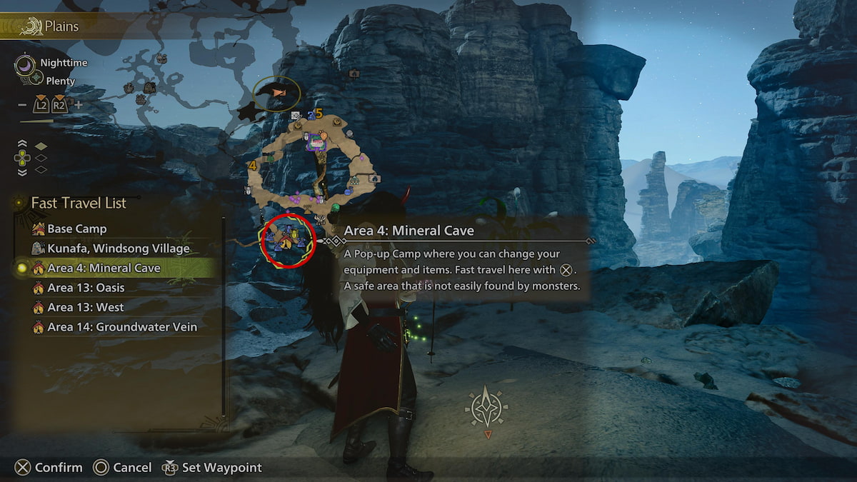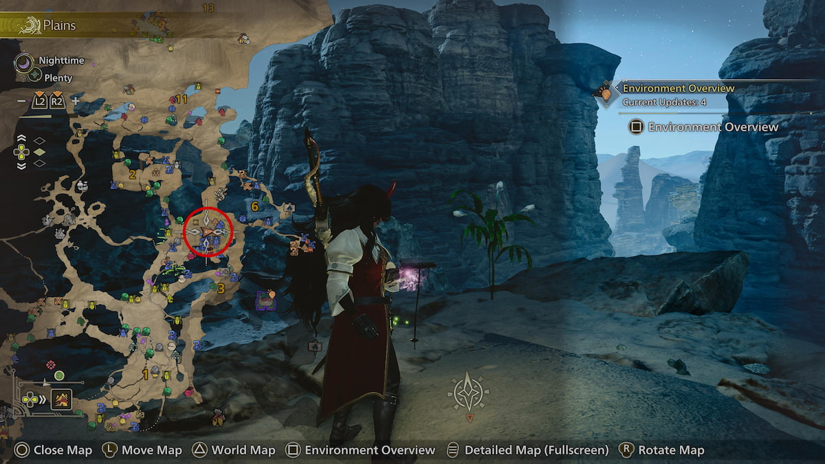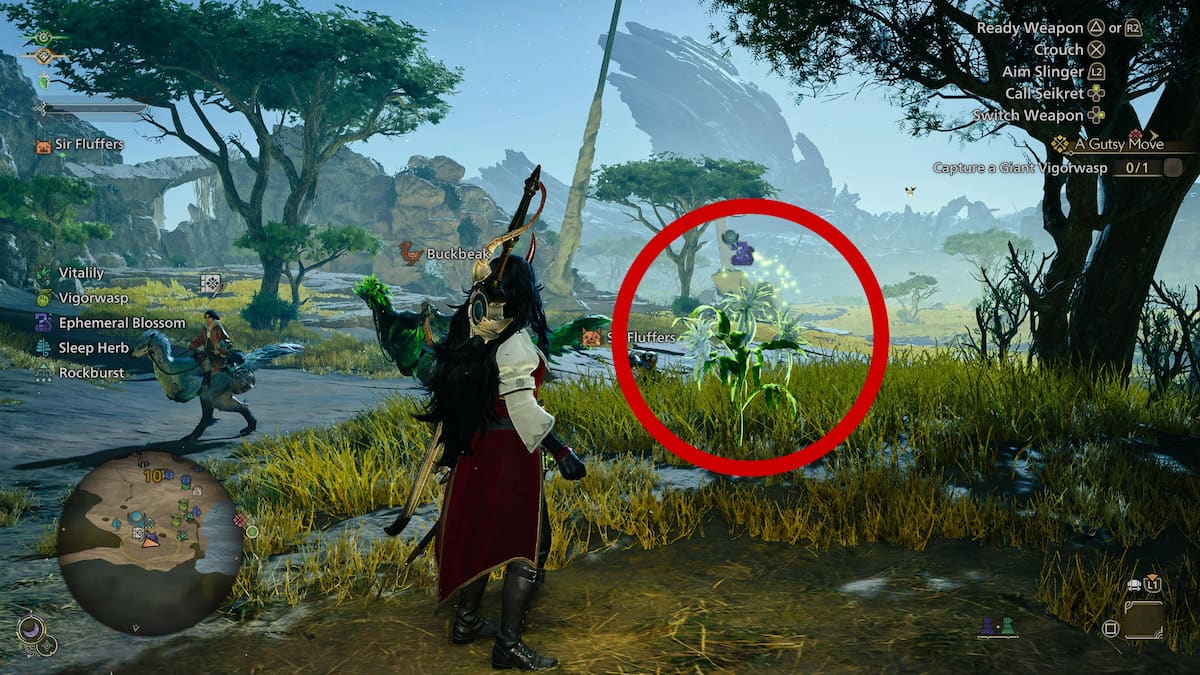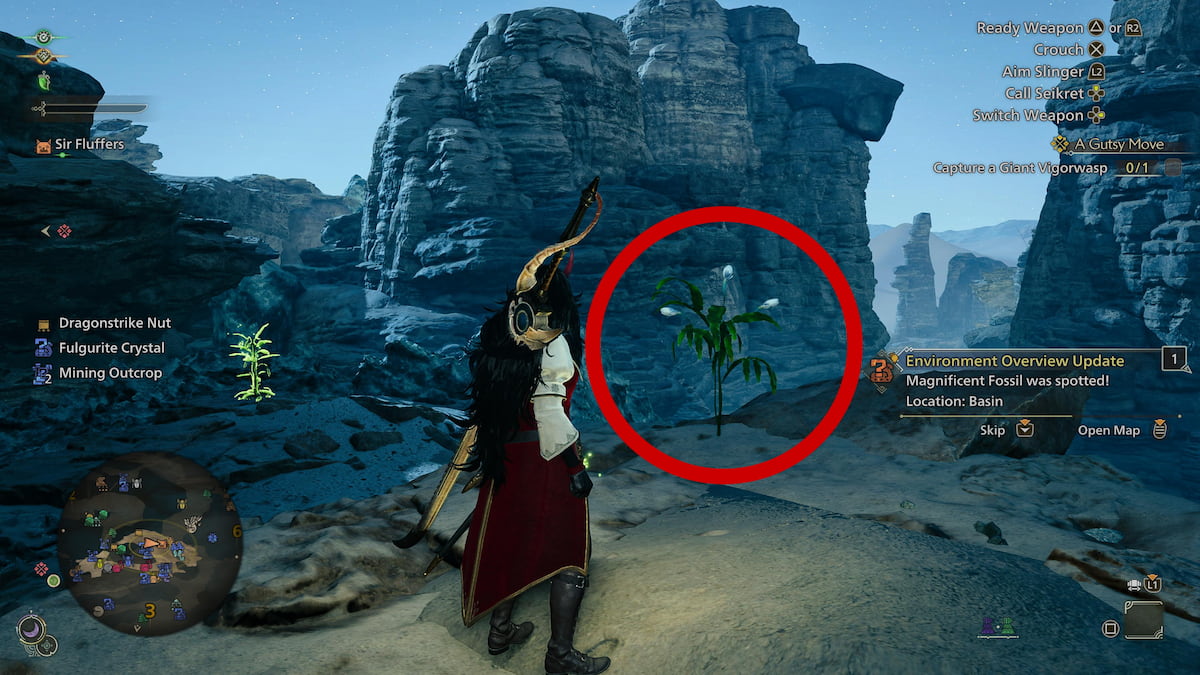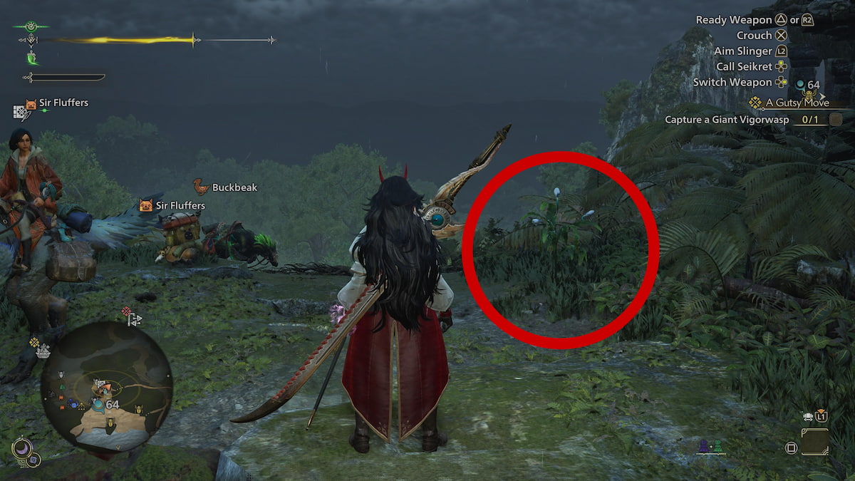 在區域 3 的頂部,您會發現夜花花粉位置。前往區域 4(礦物洞穴快速旅行效果最好)並使用您的 Seikret 爬得更高。利用一些藤蔓到達較高的區域,您會在一些採礦露頭附近找到花粉。