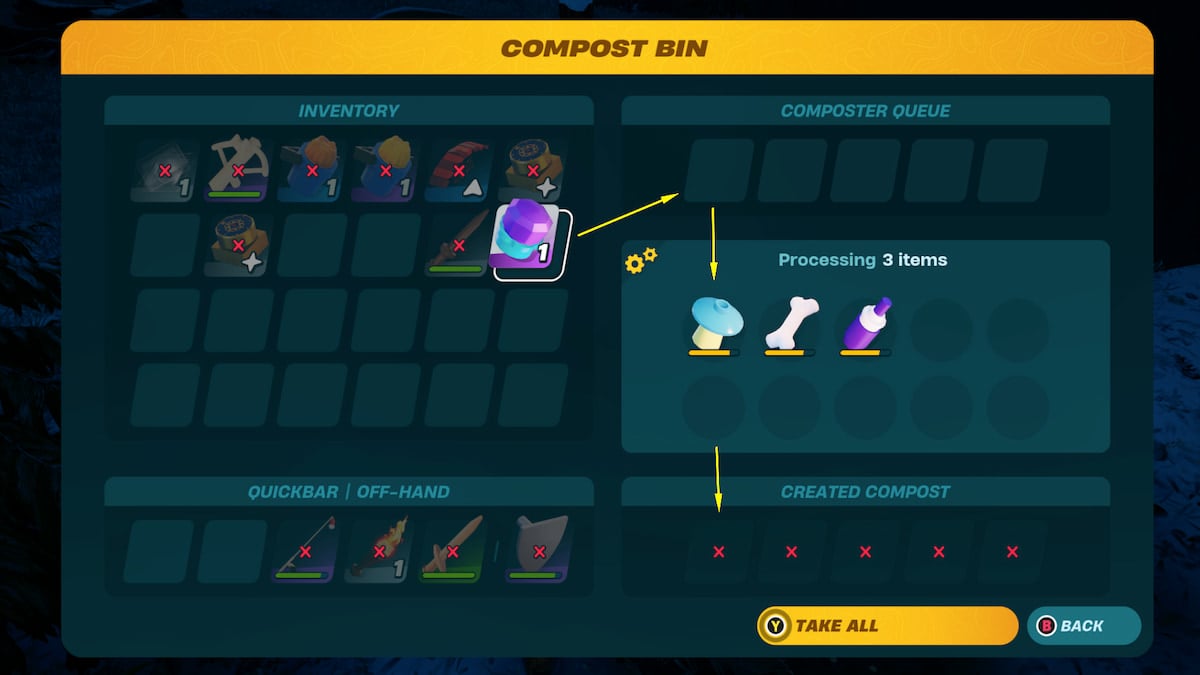 與堆肥箱互動以打開菜單並開始。然後,將要放入其中的項目拖到 Composter 隊列中。他們將在其下方的處理部分開始處理。您可以通過圖標下方的黃色儀表來跟踪他們的進度。處理需要時間,因此您必須等待它完成才能從創建的堆肥槽中收集堆肥資源。