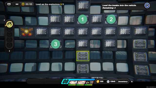 最後,您需要將所有三枚炸彈移到火車上。這可能有點棘手,因此我們創建了這些步驟來幫助您移動它們。你將從該區域的最左邊開始,但隨後的每個炸彈都會從上一個結束的地方開始。為了更容易查看,我們提供了一張圖像,顯示每個炸彈應該從哪裡開始: