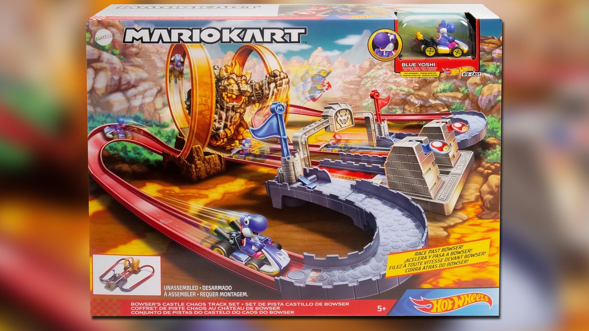 該套裝還具有雙環,可以連接到其他 Hot Wheels 軌道,並配有光滑的 Blue Yoshi 車輛。砸碎超級蘑菇發射器並儘量不要被砸碎——這基本上就是《馬里奧賽車》現實生活中的混亂。