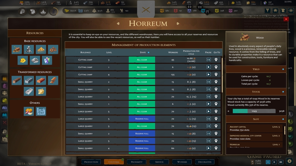 從 Horreum 中,您可以暫停特定資源的生產或監控哪些建築物已達到最大存儲容量,但它不會增加任何資源的基礎儲備。